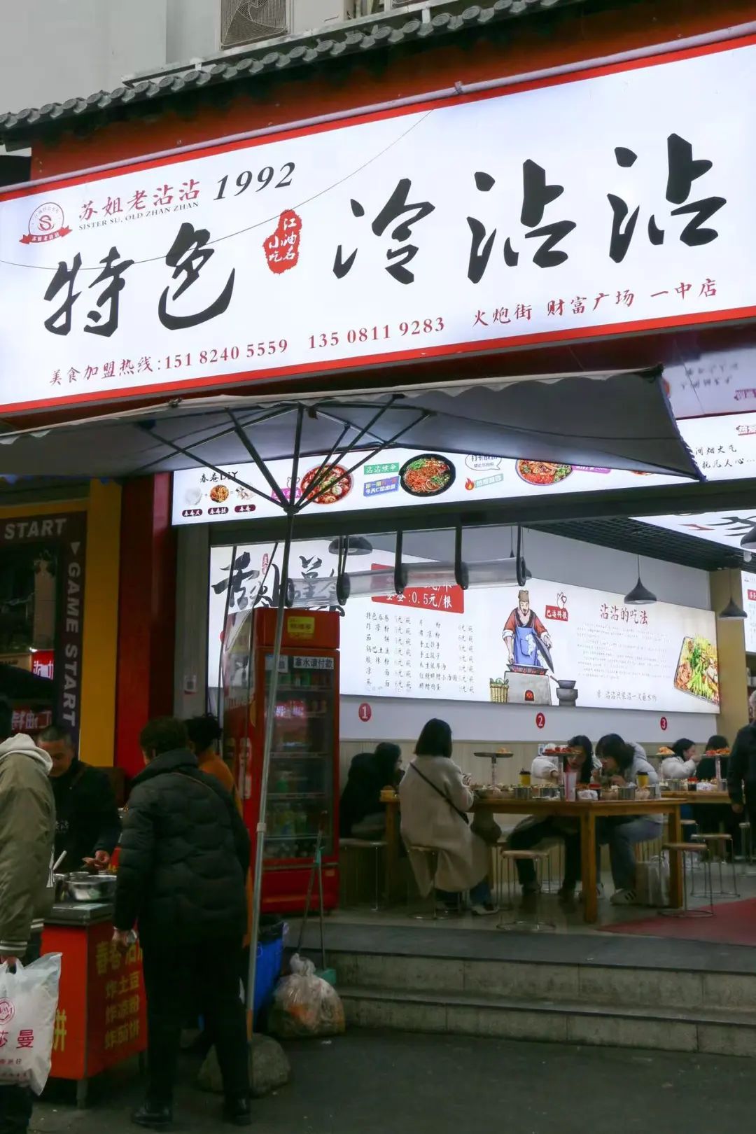 打车回江油城里,我们决定去火炮街吃冷沾沾。选了店铺宽敞有座位的苏姐老沾沾,坐下一看,对面也有家同名路边摊,原来是一家。