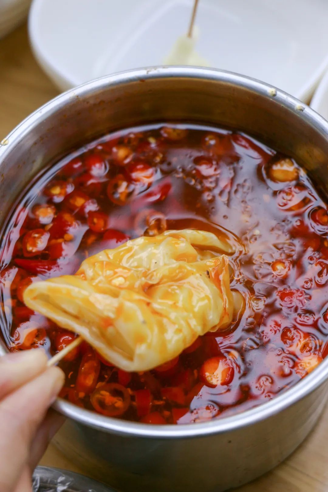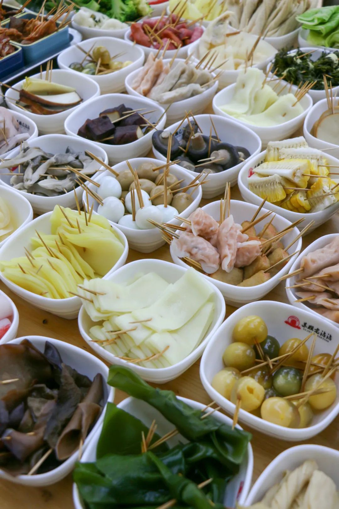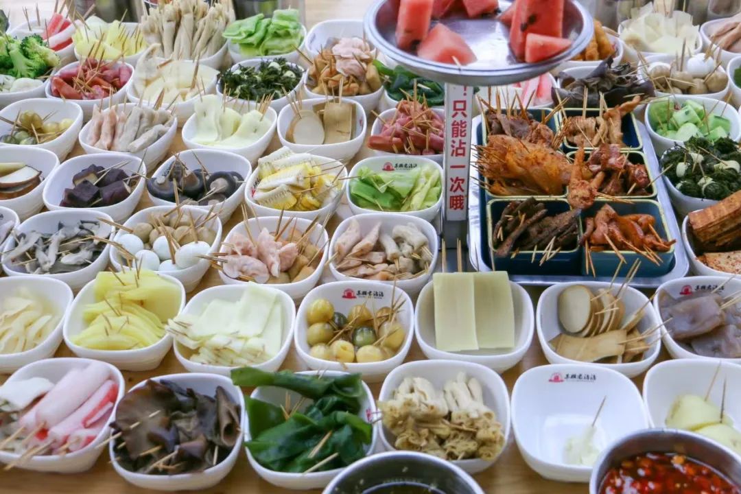 随坐随吃,有3种蘸料可选,一大桌各式各样的荤菜、素菜串在牙签上,你只需要挑选喜欢的菜去蘸料里滚一圈就可入口,有点中式下午茶的感觉。