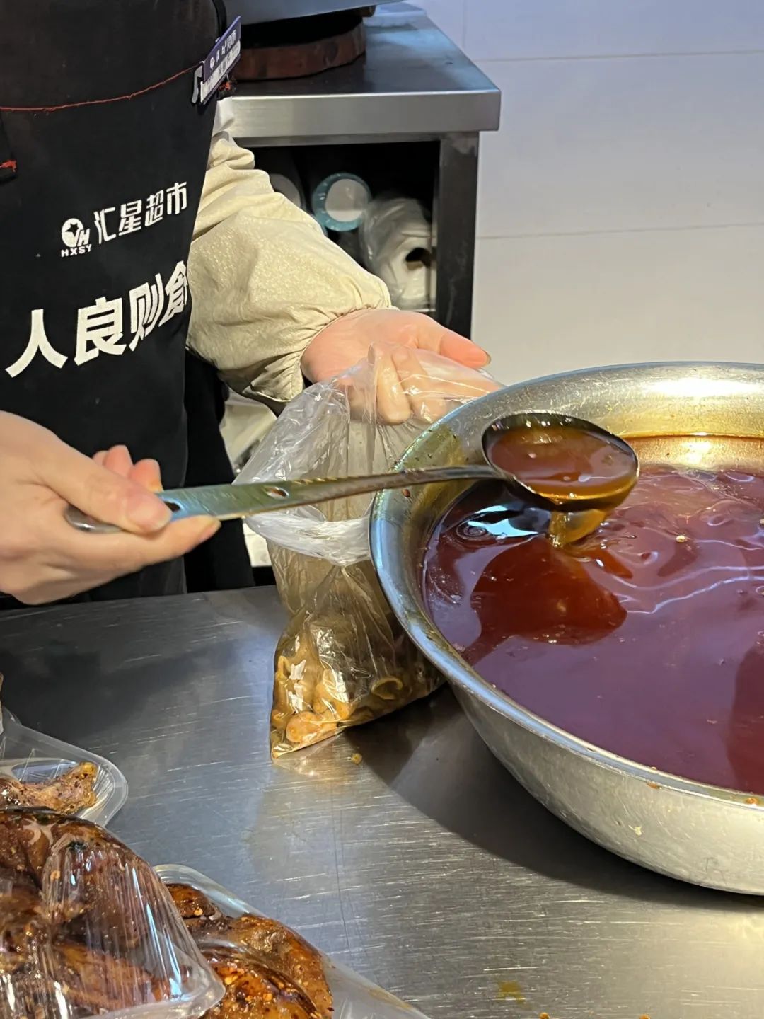 最后在滴滴师傅的热心推荐下,我们去汇星超市(平等街总店)熟食区打包了火锅肥肠,称完重,孃孃再从大盆里舀红汤进去,拎回家煮些土豆进去,在没有配米饭的情况下,快速炫完。