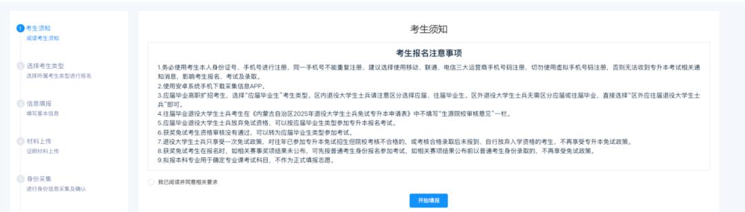 认真阅读考生须知所有内容(此处截图为演示内容,请以系统正式说明为准),按照页面提示勾选“我已阅读并同意相关要求”,点击“开始填报”进入下一步。