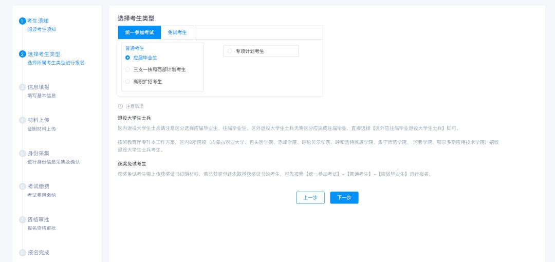 根据页面提示选择考生类型。应届毕业生(含2024年12月31日前取得毕业证书的我区高职扩招应届考生),选择【应届毕业生】考生类型;区内退役大学生士兵考生请注意区分选择应届、往届毕业生。区外退役大学生士兵考生无需区分应届或往届毕业,直接选择【区外应往届毕业退役大学生士兵】即可。
