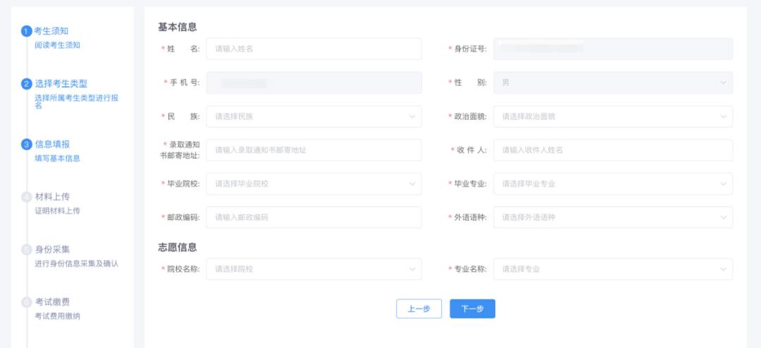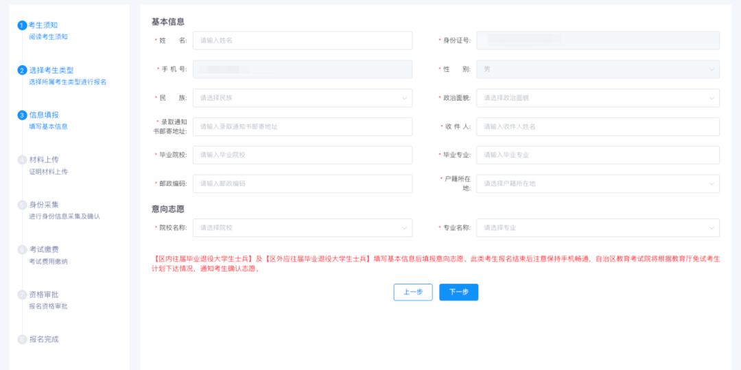 【区内往届毕业退役大学生士兵】及【区外应往届毕业退役大学生士兵】填写基本信息后填报意向志愿,录取时不再征集考生志愿。此类考生报名结束后注意保持手机畅通,自治区教育考试院将根据教育厅免试考生计划下达情况,通知考生确认志愿。