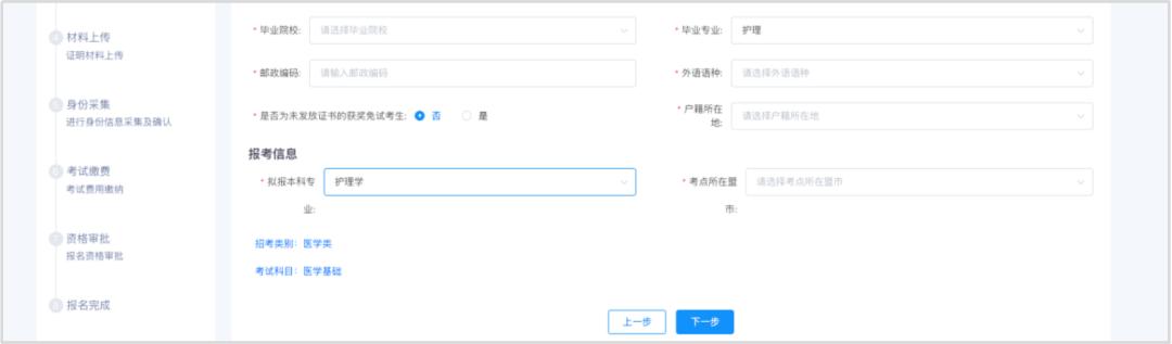 统一考试考生(应届毕业生、高职扩招考生、专项计划考生、“三支一扶”和“西部计划”考生)根据专科专业选择拟报本科专业,系统自动显示对应招考类别及专业课考试科目(拟报本科专业仅用于确定专业基础课考试科目),免试考生不显示专业基础课考试科目。