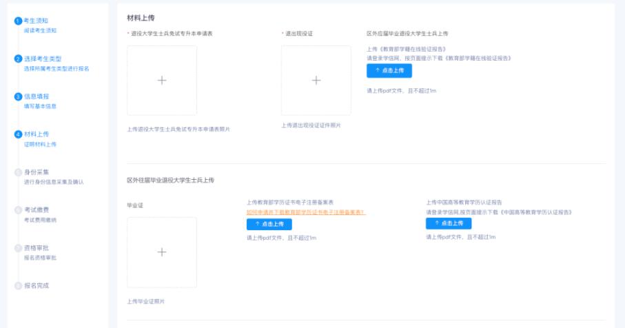(3)“三支一扶”和“西部计划”考生上传《教育部学历证书电子注册备案表》或《学历认证报告》。“三支一扶”考生还需上传相关部门盖章的《高校毕业生三支一扶服务证书》,“西部计划”考生还需上传相关部门盖章的《大学生志愿服务西部计划志愿服务证》。如考核期满且合格没有颁发证书,则需上传相关部门出具加盖公章的考核等级证明材料。