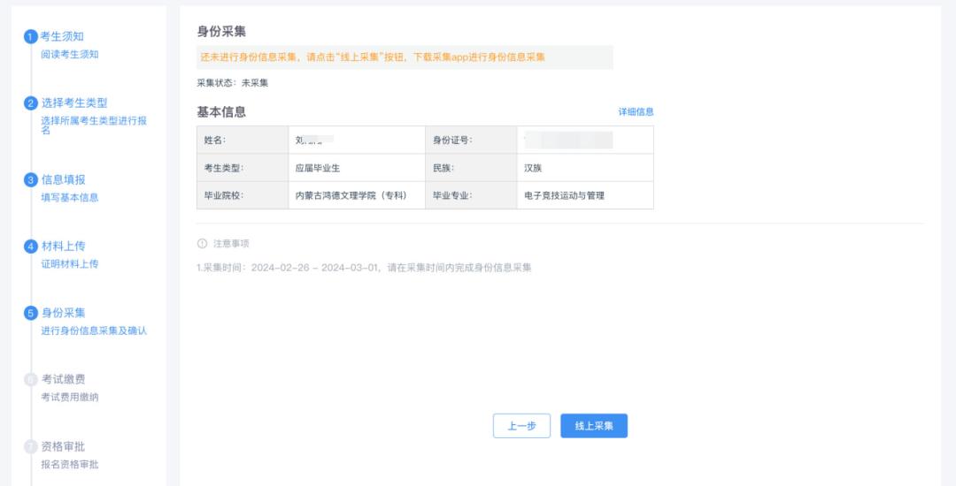 考生需准备个人身份证,点击页面右下角“线上采集”按钮,用安卓手机扫描系统弹出的二维码图片(不支持苹果手机)下载身份信息认证 APP,在手机端使用下载好的 APP完成身份信息采集,报名审核结束之前请勿删除 APP。