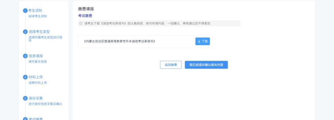 根据页面提示下载并核对《内蒙古自治区普通高等教育专升本诚信考试承诺书》内容,确认无误后点击页面右下角“我已阅读并确认相关内容”按钮。