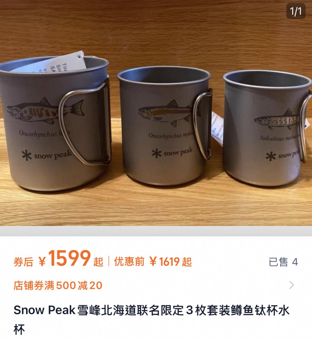 处在鄙视链顶端的是日本品牌雪诺必克(Snow Peak)的钛杯。一只容量450ml的钛杯淘宝售价329元起,连配套的钛金属筷子都要319元一双。最火的北海道联名系列——在灰色的Snow Peak钛杯上画一只鳟鱼,就成为了钓鱼佬们无法割舍的天选水杯。杯子限量发售,一套三只的价格目前在国内平台上被炒到了1600元。