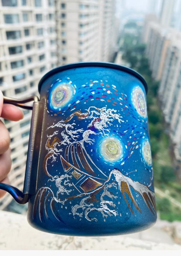 纯度只是钛鄙视链的第一环:钛的打磨工艺也有讲究,冰花工艺贵过喷砂工艺;单层钛、双层钛的价格不同,后者防烫,可以做成无把手的茶杯;内钛外钢的材质远不如内外纯钛,前者重量更重,自然也烧不出“梦幻蓝”。