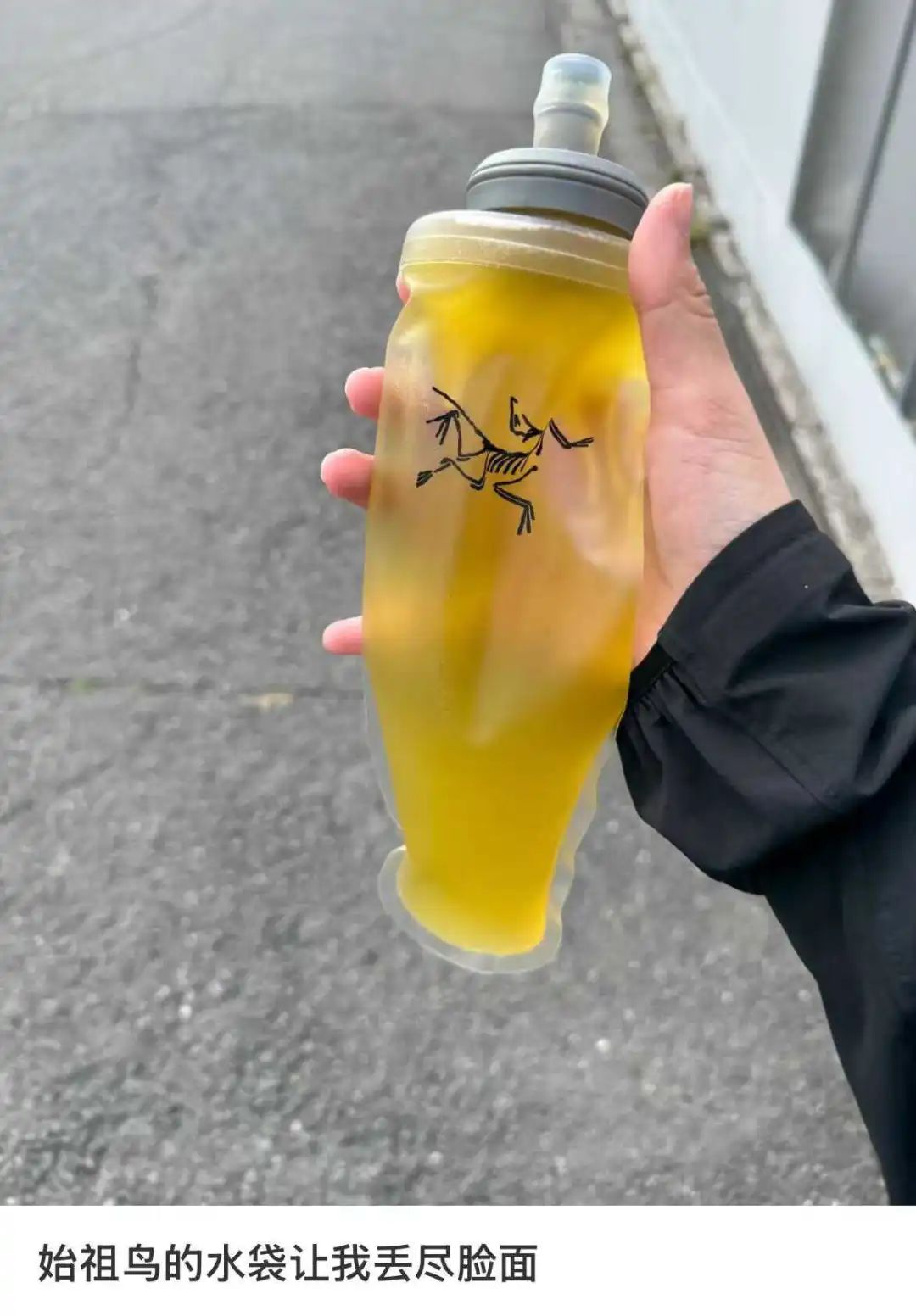 始祖鸟水袋原本的设计是专供越野跑运动使用,设置了跑步中的防呛水系统,要用嘴咬一下吸嘴才能吸上水,不仅出水慢、非专业跑者几乎用不到,还因为质地柔软,装上有颜色的茶水十分容易令人误解。堪比尿袋的塑料水袋,在国内平台上能卖到600元的天价。但Logo大于一切,表面说着“让我丢尽脸面”的中产,私底下把尿袋盘成最心爱的大玩具。