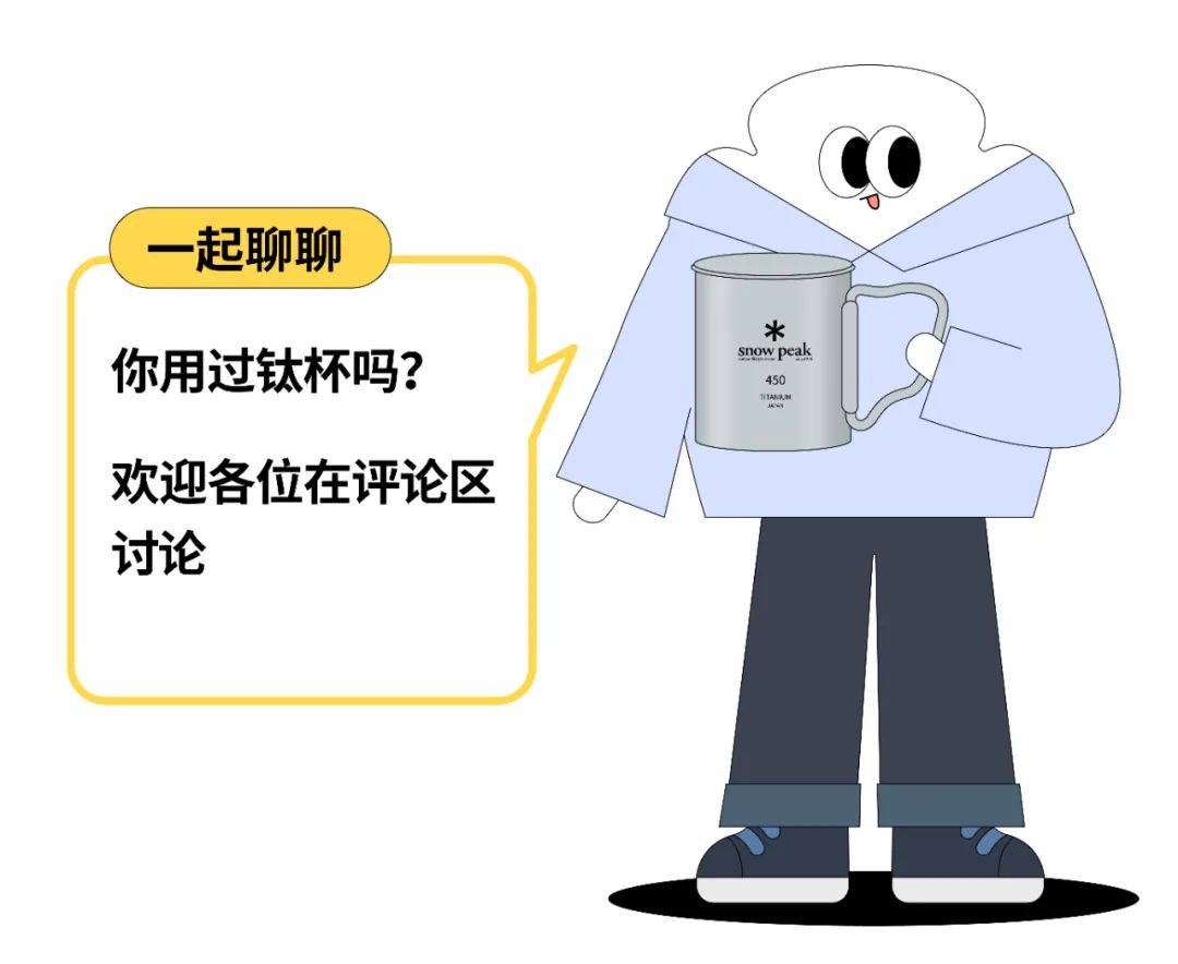 一只300ml的Snow Peak单层钛杯重量只有50g,“端在手里轻若无物”。于是户外OG们总在30斤的小鹰重装包上外挂一只Snow Peak钛杯,显得游刃有余。有人问为什么一定要挂在包上,“方便路上喝别人的冰可乐”。