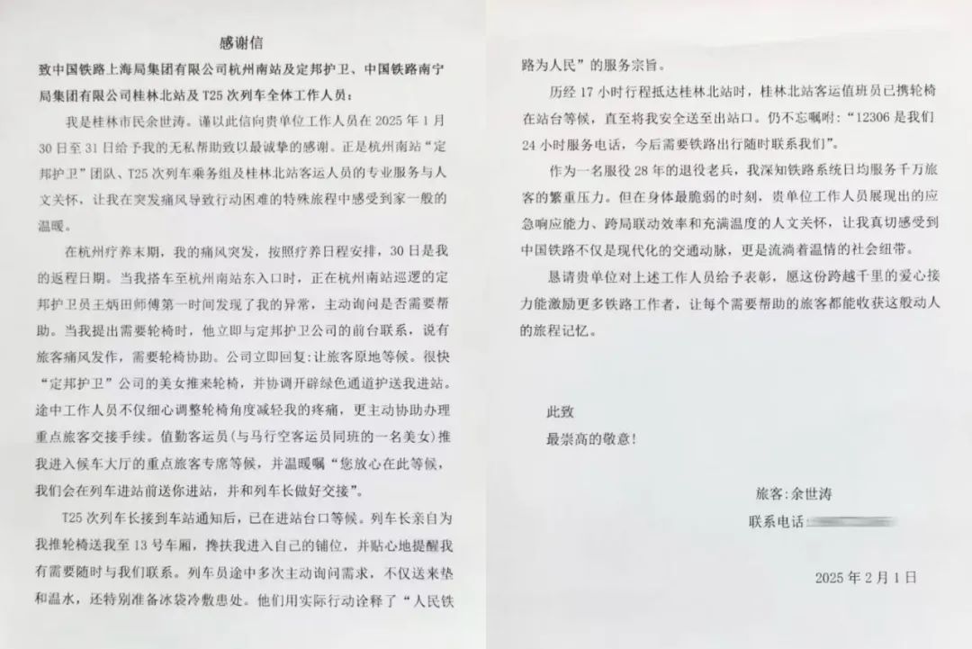 近日,浙江杭州南站管委会收到一封跨越1300公里的感谢信