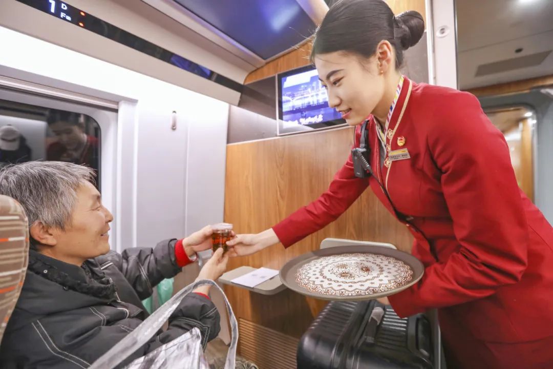 天津客运段各次旅客列车推出“五个一”适老化服务温馨举措(一杯暖心热水,一次专属行程提醒,一次全面设备介绍,一次贴心行李协助,一次旅途需求问询),温暖老年旅客出行。