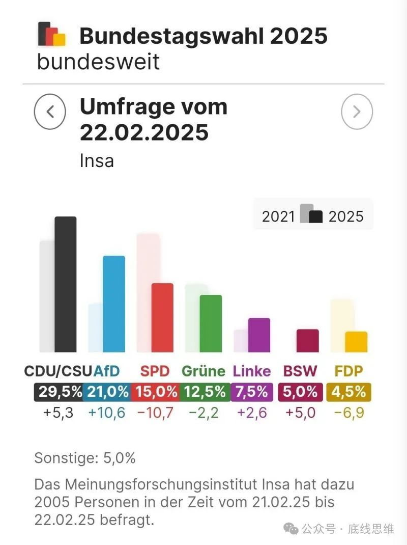 大选前一天民意调查结果。图片来自 《柏林晨报》2025年2月22日按目前的民意调查结果看,联盟党赢得30%左右的选票应该不是悬念。从经济政策角度看,联盟党应该和自由民主党以及德国选择党合作。但梅尔茨已当众一再宣布,绝不选择德国选择党作为联合执政伙伴,联盟党只有和社会民主党或者绿党合作。
