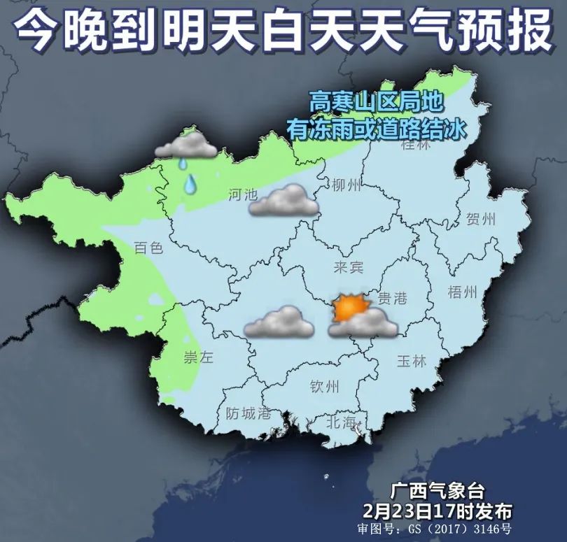 今天晚上到明天白天,桂林、柳州、河池、百色、崇左等市阴天有分散小雨,高寒山区局地有冻雨或道路结冰,其它地区阴天到多云。