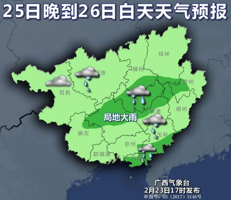 25日晚上到26日白天,桂东部分地区有小到中雨、局地大雨,其它地区阴天有小雨。