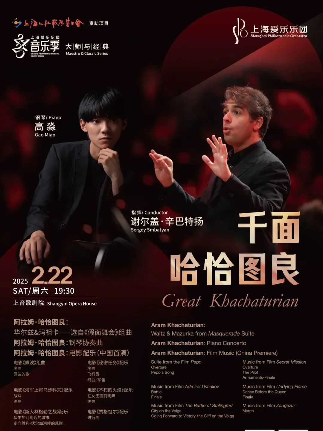 人们对哈恰图良音乐的印象大多停留在《马刀舞》,一首具有很强辨识度的舞曲,其节奏强劲,旋律同音反复,半音下行,滑音,不协和音程叠置,速度不断加快,听起来特别带劲儿!这次,上海爱乐乐团邀请了哈恰图良的同胞,亚美尼亚国立交响乐团的音乐总监谢尔盖·辛巴特扬指挥,通过对作曲家的钢琴协奏曲、戏剧音乐、电影配乐等多部作品的挖掘和演绎,展示了一个不同面向的哈恰图良。且这首标志性的马刀舞并不在正曲中,而作为加演奉上,可想而知最后燃爆全场的那刻。