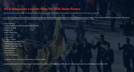 4、2026亚运会11款电竞项目官宣 22日,亚洲奥林匹克理事会发布2026年亚洲运动会电子竞技项目名单,共11个项目,包括竞技武术( 街头霸王系列、铁拳系列、 拳皇系列)、宝可梦大集结、王者荣耀、英雄联盟等。(@人民电竞)