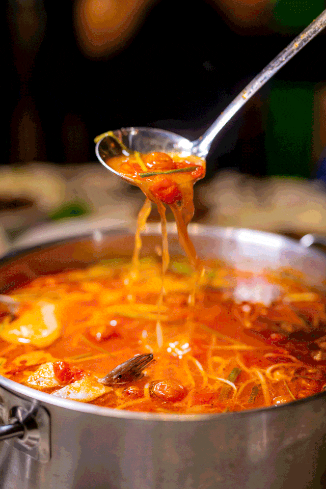 苗岭酸汤关岭牛肉:选用西冷切成薄片,放入酸汤火锅中边涮边吃,配上经典蘸料,入口醇厚,肉质爽嫩,回味无穷。