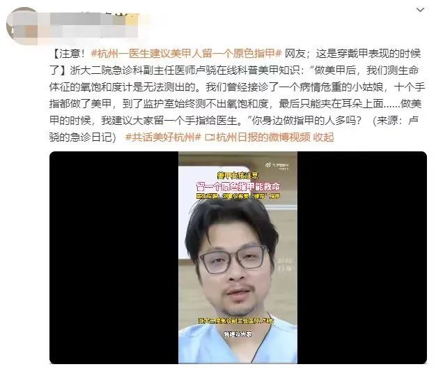 浙大二院急诊医学科卢骁副主任医师近日在社交媒体上发了一条健康警示:爱美甲的朋友记得给自己留一个“救命指”。
