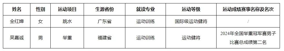 根据《体育总局办公厅关于做好2025年高校保送录取优秀运动员有关事宜的通知》(体科字〔2025〕3号)精神和《暨南大学2025年优秀运动员保送生招生简章》相关规定,经考生本人申请,我校组织相关学科专家对考生报名材料进行审核,现将我校2025年优秀运动员保送拟录取名单予以公示。