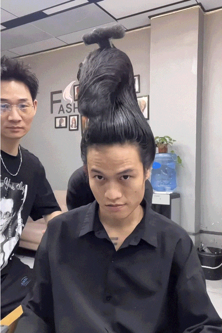 罗福兴设计的发型以前我觉得杀马特发型很重要,但我从来没有想过一个问题,大家也会审美疲劳——杀马特发型无非就那几款,比如“偏高”,斜刘海,圆圆尖尖的,蓬得像爱心一样的。那我在这个基础上爆改行不行?好像也行。