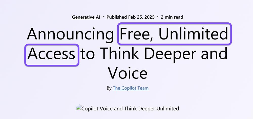 智东西2月26日报道,今日,微软宣布面向所有Copilot用户推出免费、无限制访问的Voice(语音) 和Think Deeper(深度思考)功能,由OpenAI的o1模型提供支持。