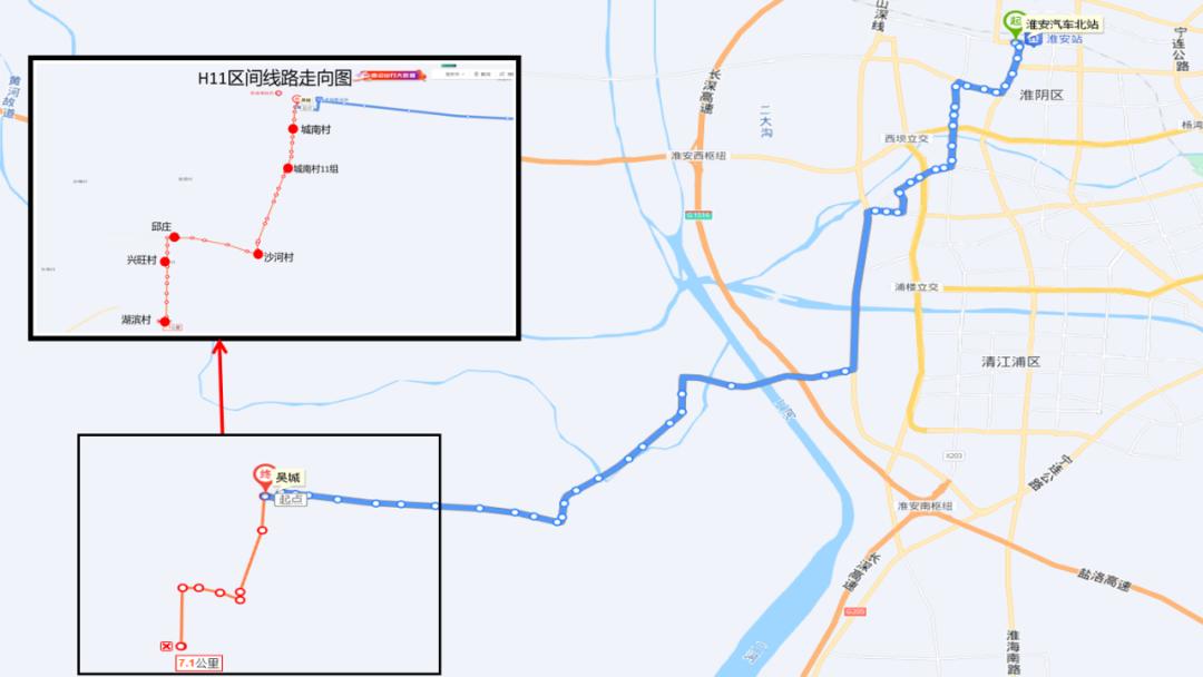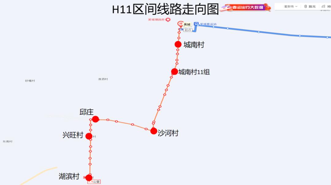 延伸后的H11路,每天上行(湖滨村-淮安汽车北站)、下行(淮安汽车北站-湖滨村)各6班。上行班次为:6:20、8:30、9:30、12:20、14:50、17:10;