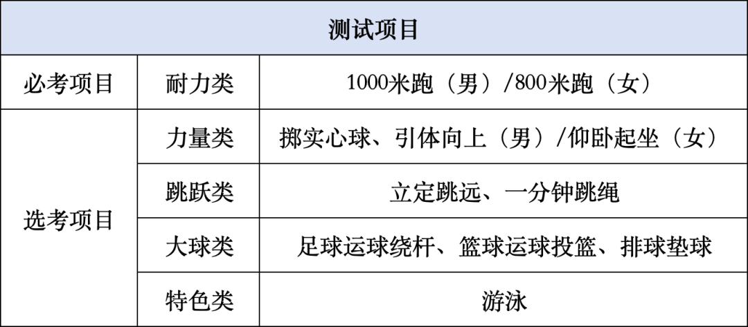 (二)体育考试项目共分为耐力、力量、跳跃、大球、特色等5个类别。具体类别和项目如下: