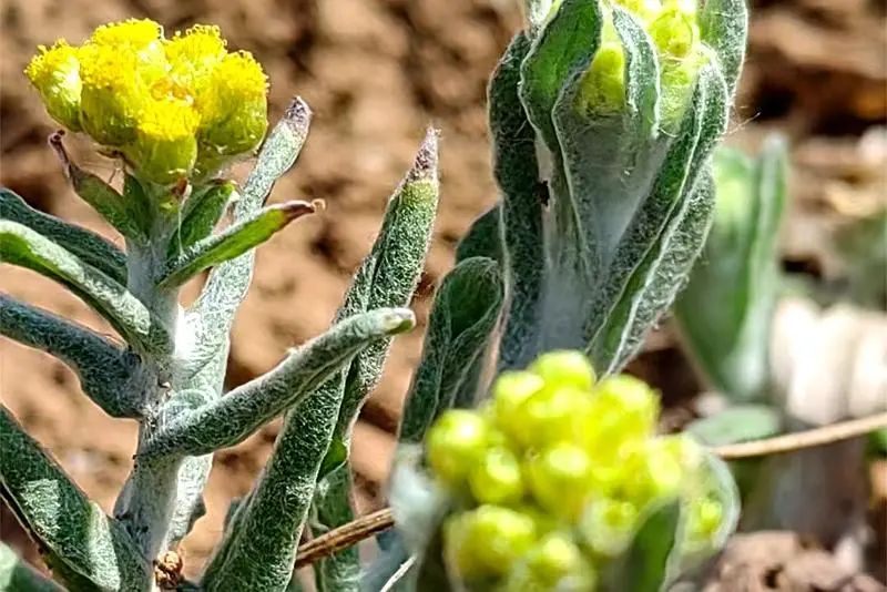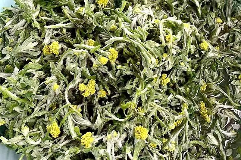制作面蒿粑粑的原材料有两种,一种是田间地头随处可见的小黄花,俗称“面蒿”,学名鼠曲草;另一种是糯米面粉。惊蛰时节,大地回暖,面蒿从沉睡中苏醒,冒出嫩绿的新芽,绽放出星星点点的小花。此时,正是采摘面蒿的最佳时机。