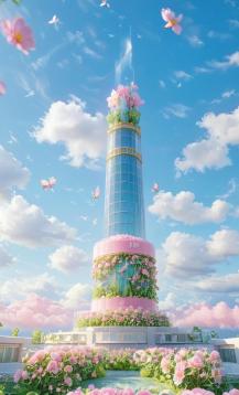 桥塔缠绕着花枝
