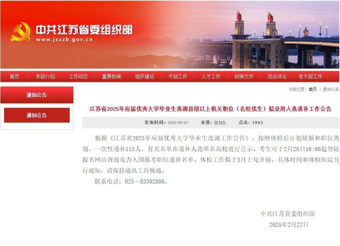 根据《江苏省2025年应届优秀大学毕业生选调工作公告》,按照体检后计划缺额和职位类别,一次性递补115人,有关名单在递补人选所在高校进行公示。考生可于2月28日16:00起登陆报名网站查询是否入围报考职位递补名单。体检工作拟于3月上旬开展,具体时间和体检医院另行通知,请保持通讯工具畅通。联系电话:025-83392800。