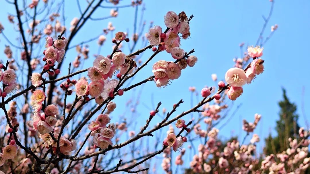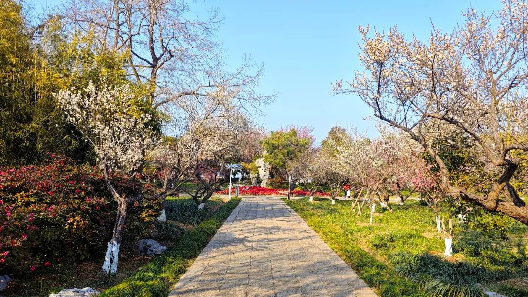 据了解,淀山湖梅园始建于1979年,占地约150亩,得天独厚的地理位置让这里土质肥沃,气候宜人,十分适合各色花卉植被生长。依湖而建的园区让游客在饱览梅花胜景的同时,还能尽享湖光山色,感受一场沁人心脾的春日之旅。梅园内种植各色梅花300多株,品种达20余种,花期可从1月绵延至3月。这些梅树大多已有三十余载树龄,更有数株百年以上的古梅静静伫立,尽显沧桑之美。这些野生山梅,形姿古拙,花开灵秀,与江南特色的园林建筑相得益彰,共同营造出独特的幽雅意境。2023年,淀山湖梅园历经全面修缮升级,不仅增植了众多花卉,还完善了导览标识、休闲设施等配套服务,大大提升了游客的游园体验,堪称春日赏梅的理想去处。
