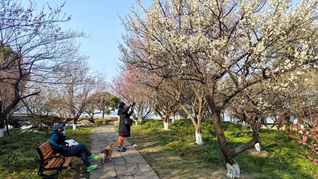 步入淀山湖梅园,幽幽的暗香令人心旷神怀,石径两旁的梅花已大片绽放、尽展婀娜。白色的“江梅”清丽脱俗,粉色的“宫粉”娇艳可人,红色的“朱砂”热烈似火,将公园幻化成一片香雪海,粉妆玉砌,一片春意盎然。清溪、小桥、汀步散布其间,相映成趣,充满诗意画境。不少市民游客和摄影爱好者得知梅园开放,纷纷带着长枪短炮慕名而至,用镜头定格这一抹早春的诗意。