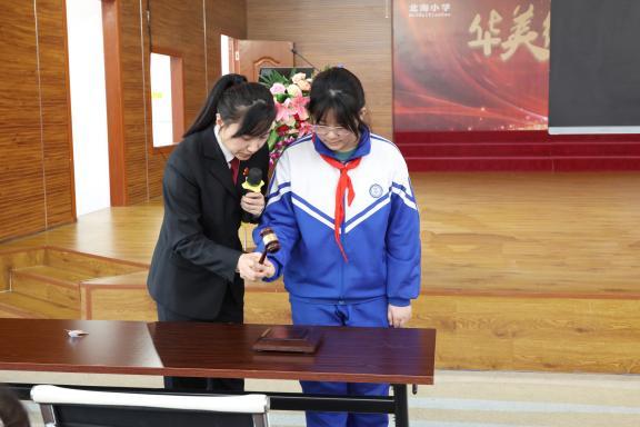 宣讲结束后,法官向同学们介绍了法徽、法槌等司法标志物的设计内涵与象征意义,并组织学生开展“沉浸式体验”:穿戴法袍感受庭审庄严,模拟敲击法槌体会司法权威,零距离感受司法工作。