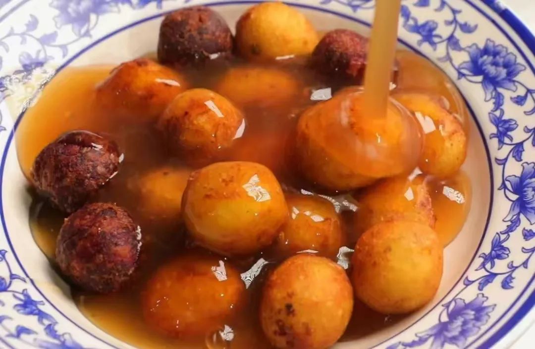 3、永昌甜丸子——哪吒娘亲的私藏甜品丸子主体是土豆,用土豆泥揉成丸子,在油里炸过后还要浇上糖水,这样做出来的丸子脆中带点甜,建议和敖丙分着吃(怕胖)