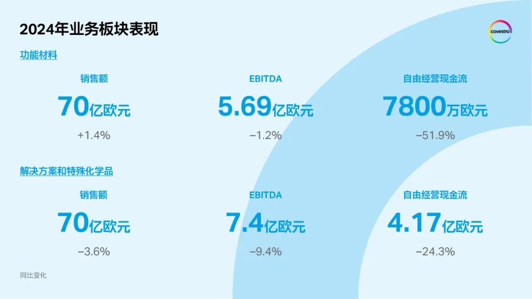 2024年第四季度,科思创的销售额同比增长0.9%至约 34亿欧元(2023年同期:33亿欧元)。四季度EBITDA 同比大幅增长 44.7%至1.91亿欧元(2023年同期:1.32亿欧元),自由经营现金流则同比上涨246.6%至2.53亿欧元(2023年同期:7300万欧元)。