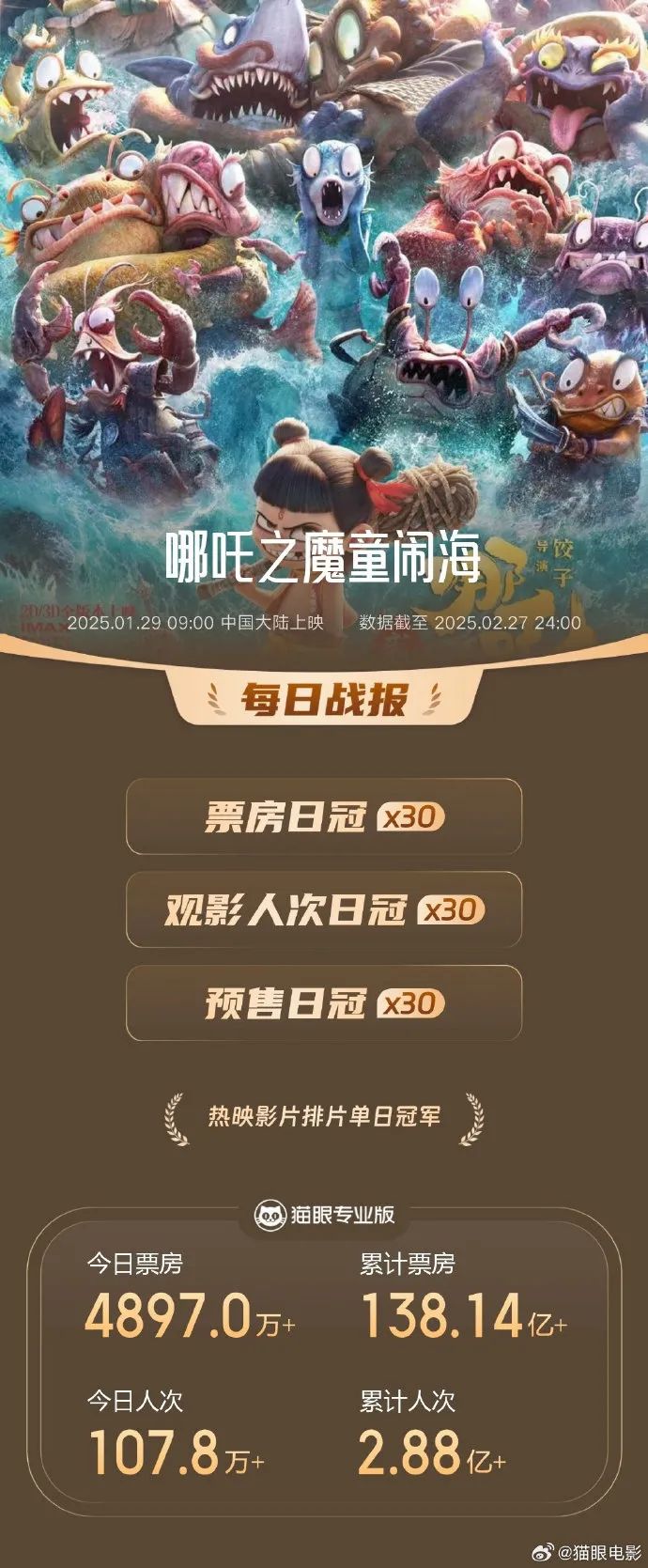 《哪吒2》连续30天登顶单日票房榜。