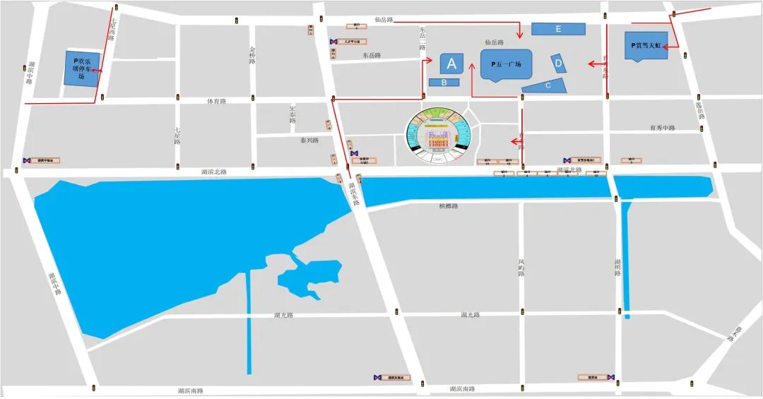 进场时,可以通过湖滨东路、湖滨北路、体育路等3个方向到市体育中心西门、南一门路段和体育路五一广场路段下车,步行至体育场检票入场。