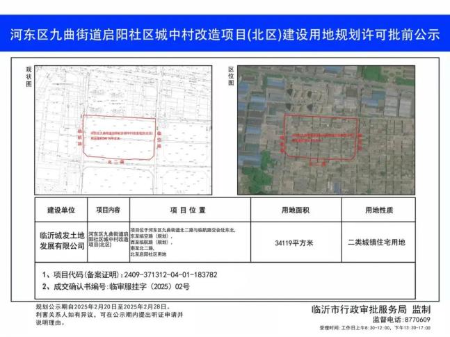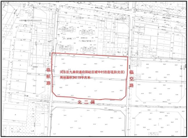 项目位于河东区九曲街道北二路与临航路交会处东北,东至临空路(规划),西至临航路(规划),南至北二路,北至启阳社区用地