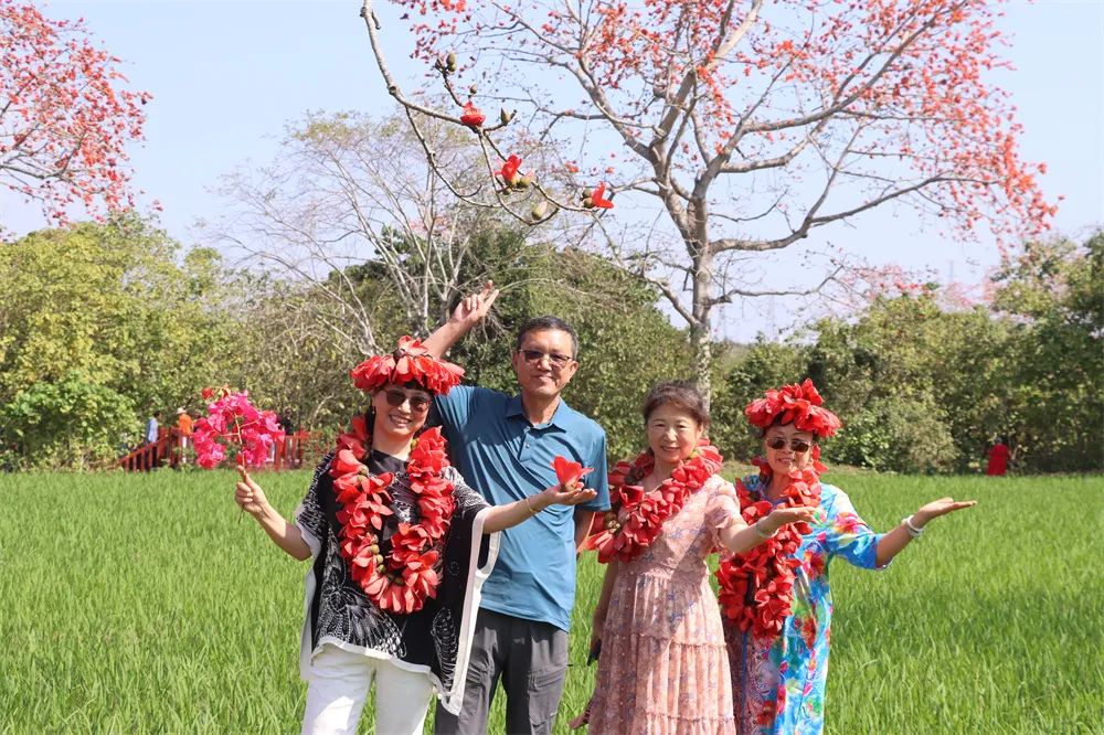 内蒙古游客和其他游客一起打卡拍照(杨萍 摄)叉河镇排岸村是中国少数民族特色村寨之一,也是海南为数不多的全黎族同胞聚集地,这里拥有独具特色的木棉红景观、浪漫诗意的田园风光和丰富多彩的民族文化。走进排岸村木棉观景区,稻田与木棉的完美邂逅,交织成一幅醉美田园画卷,焕发出蓬勃的生机与活力。市民游客纷纷举起手中的相机,将这美好的春日美景定格在镜头之中,同时也定格下各民族和谐共处的美好瞬间。当地的黎家阿姐身着绚丽多彩的民族服饰,生动地展现着稻田丰收时节的热闹场景,为景区增添了浓郁的民族风情,吸引着游客们去了解、去融入黎族文化,促进各民族之间心灵的沟通与情感的交融。