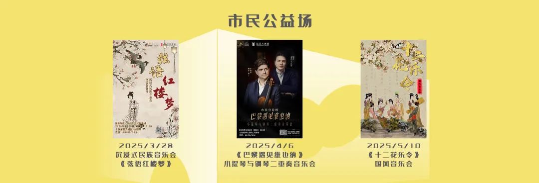 此外,剧院开业至今深受观众喜爱的公益系列“经典荟萃-漫步音乐三百年”、“市民公益场”系列也发布了最新剧目菜单。最高票价封顶80元,包括有《二十四节气亲子互动音乐会》、沉浸式民族音乐会《弦语红楼梦》、《巴黎遇见维也纳-小提琴与钢琴二重奏音乐会》、童声绘春 音跃保利-合唱团专场音乐会等一系列演出。