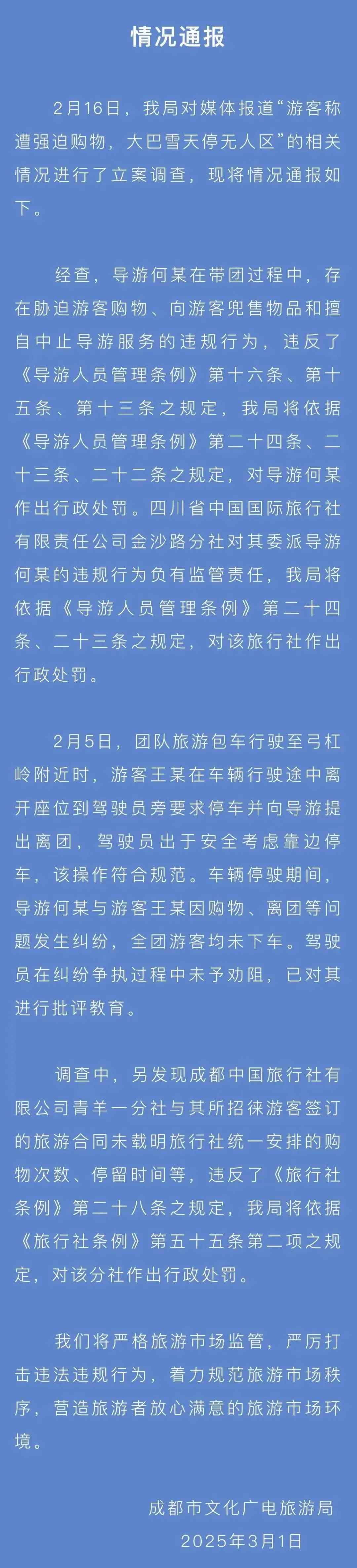 4.“游客称遭强迫购物,大巴雪天停无人区”?官方最新通报:3月1日,成都市文化广电旅游局发布情况通报。经查,导游何某在带团过程中,存在胁迫游客购物、向游客兜售物品和擅自中止导游服务的违规行为,对导游何某作出行政处罚。四川省中国国际旅行社有限责任公司金沙路分社对其委派导游何某的违规行为负有监管责任,对该旅行社作出行政处罚。(央视网)