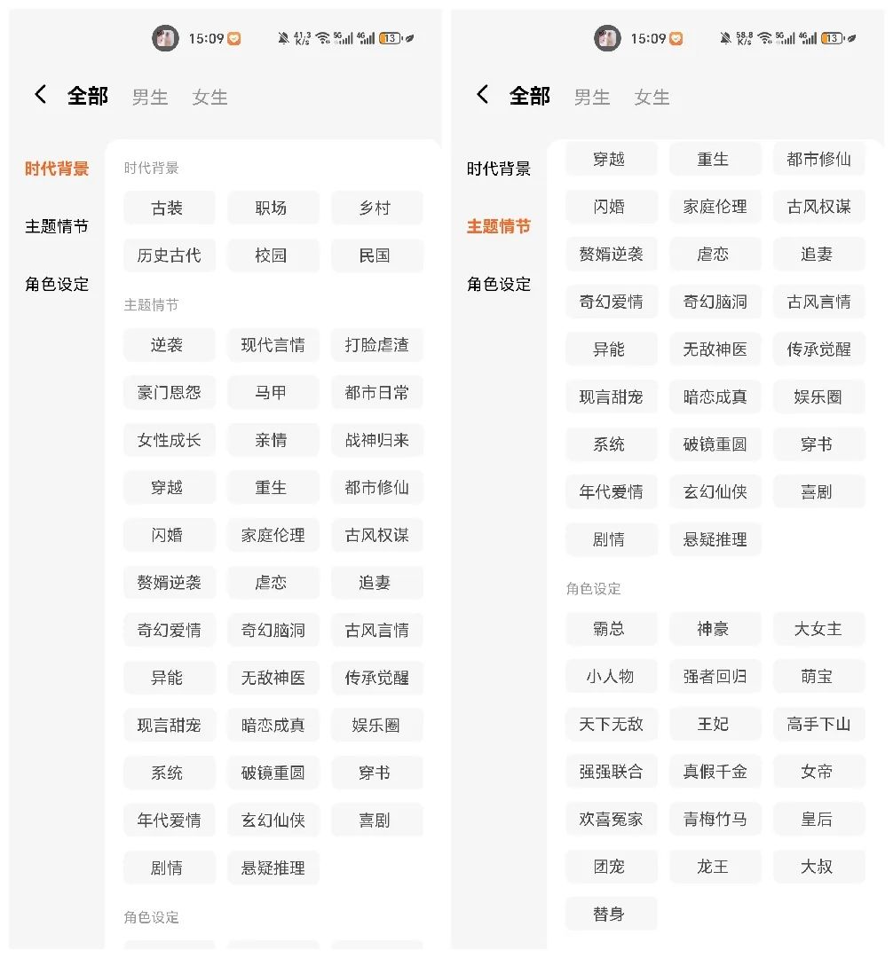 以红果免费短剧平台为例,不仅区分了男频和女频,在时代背景、主题情节和角色设定上也对题材做出了新的细分,题材选择高达60种。用户能够更加精确化地选择自己的观剧品味,另一方面也说明短剧题材的分众化趋势也越来越明显。
