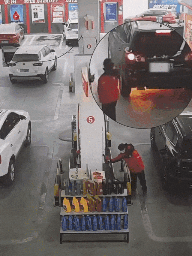 2023年3月,重庆沙坪坝区某加油站内,一车辆加完油后司机并未回头检查,在未拔油枪的情况下开车就走。