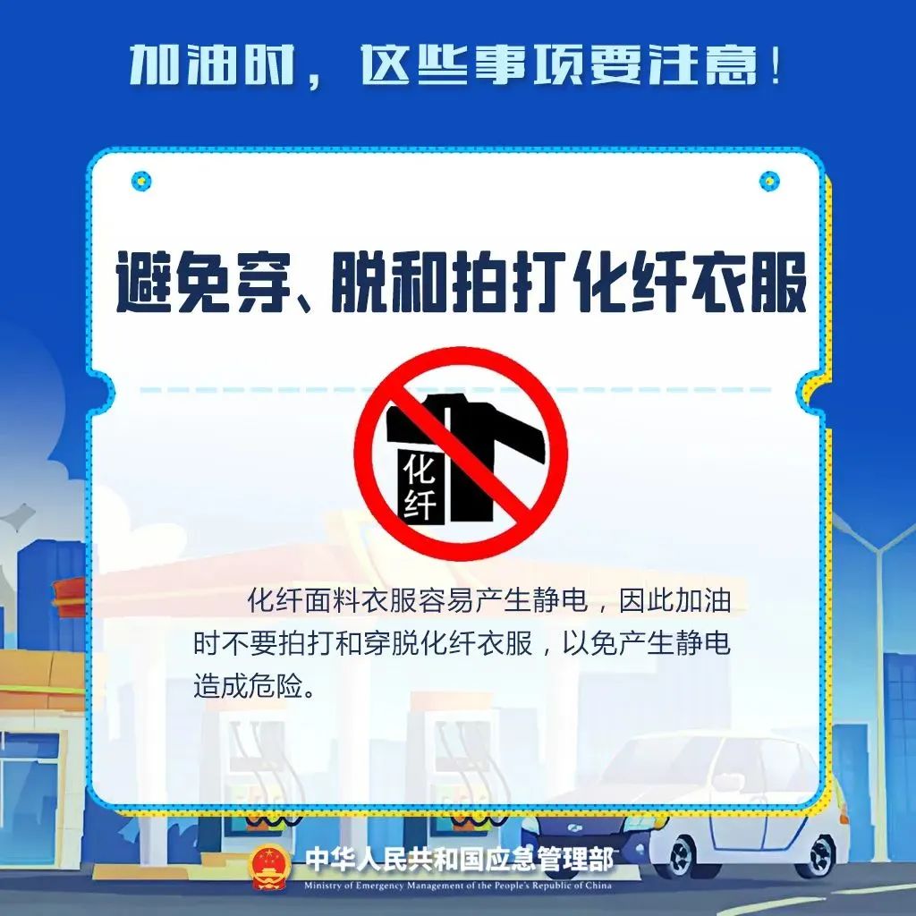 加油前触摸静电释放装置,加油时油枪与油箱口紧密接触,加油中避免走动、穿脱衣物。