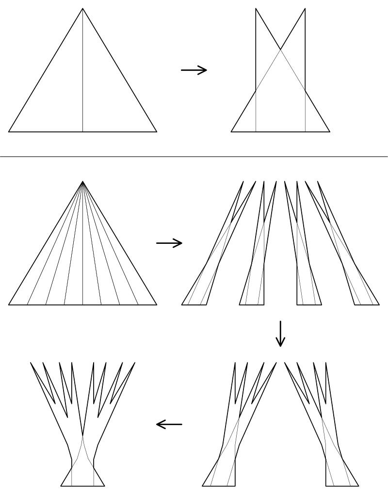 现在重新开始,把三角形平均分为 8 个,把它们两两叠在一起,再两两叠在一起,这种图形就叫作佩龙树。如果重复这个步骤,把三角形分为 16 个,32 个,……, 2n 个,显然整个图形的面积可以越来越小,并且可以证明随着步骤增长,图形面积无限趋近于 0。