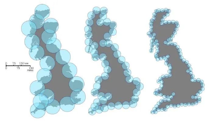 演示分形维度的逼近计算方式 | 图源:Hausdorff dimension - Wikipedia我们考虑覆盖住被测图形的小圆的个数 N(e),然后考虑对数运算[LogN(e)/Log(1/e)],当 e 趋于 0 时的极限就是分形的豪斯道夫维数。容易验证,当被测图形足够规整的时候,豪斯道夫维数就是通常意义的维数。