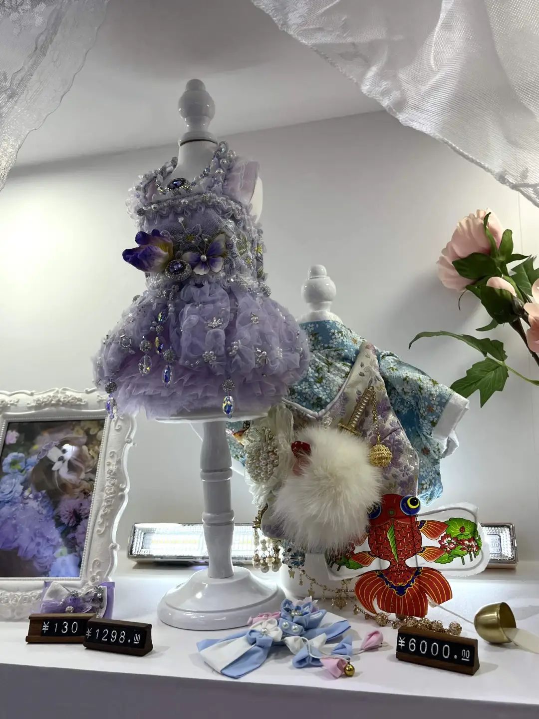 2.只为小型犬而生的高定礼服在宠物高定服饰区,我们看到了6000多元一件的小狗和服和2000多元一件的小狗洛丽塔。据说这些高定全部出自日本的设计师,工人手工缝制。“没有大狗款。”店主迅速否定了我为哈士奇穿上公主裙的想法。