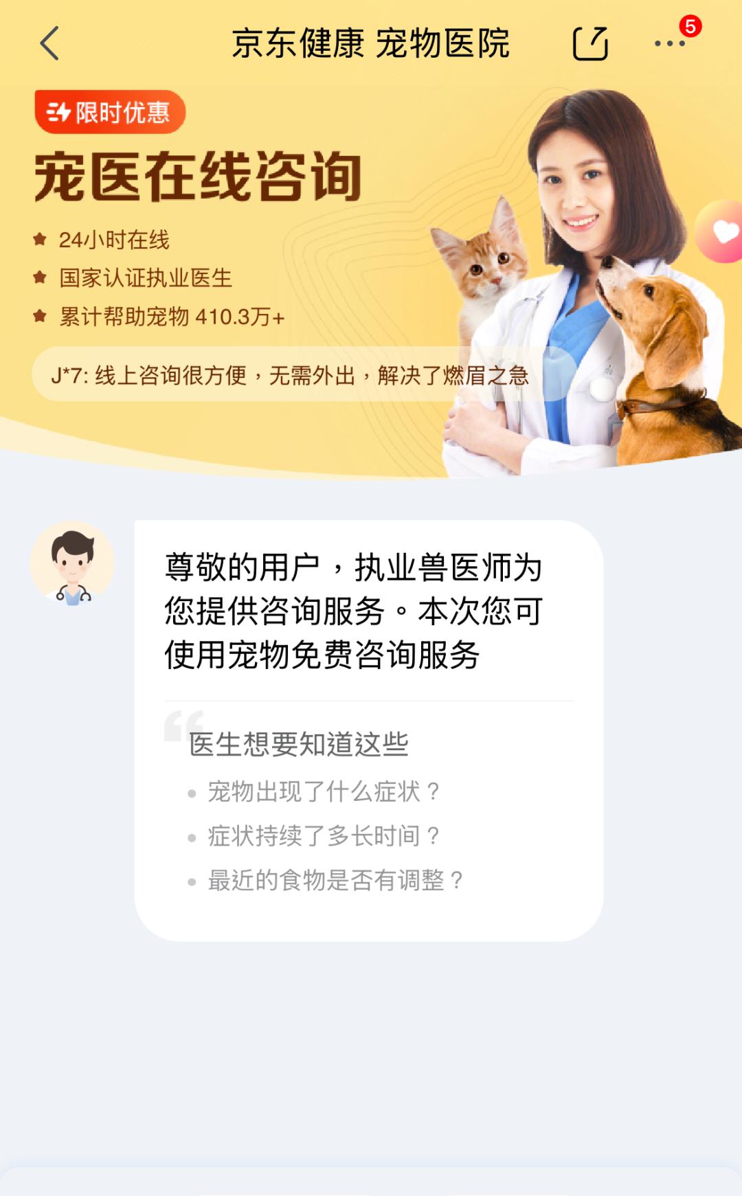 4.宠物们的互联网医院大公司们都开始发力宠物线上问诊平台。比如新瑞鹏开发了阿闻平台,和美团、饿了么合作,提供线上问诊预约、宠物用品即时配送服务,还和蚂蚁保合作推出了宠物险直赔。
