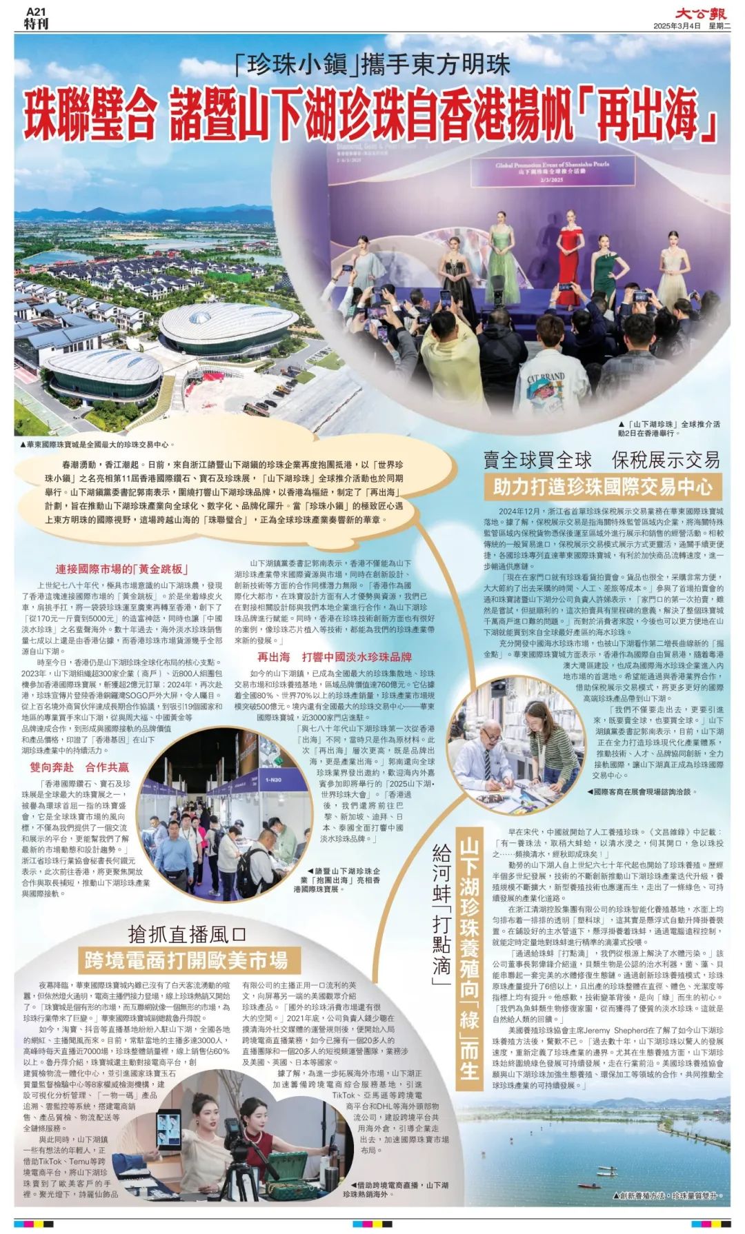 今天,香港《大公报》整版聚焦诸暨山下湖珍珠,当“珍珠小镇”的极致匠心遇上东方明珠的国际视野,这场跨越山海的“珠联璧合”,正为全球珍珠产业奏响新的华章。